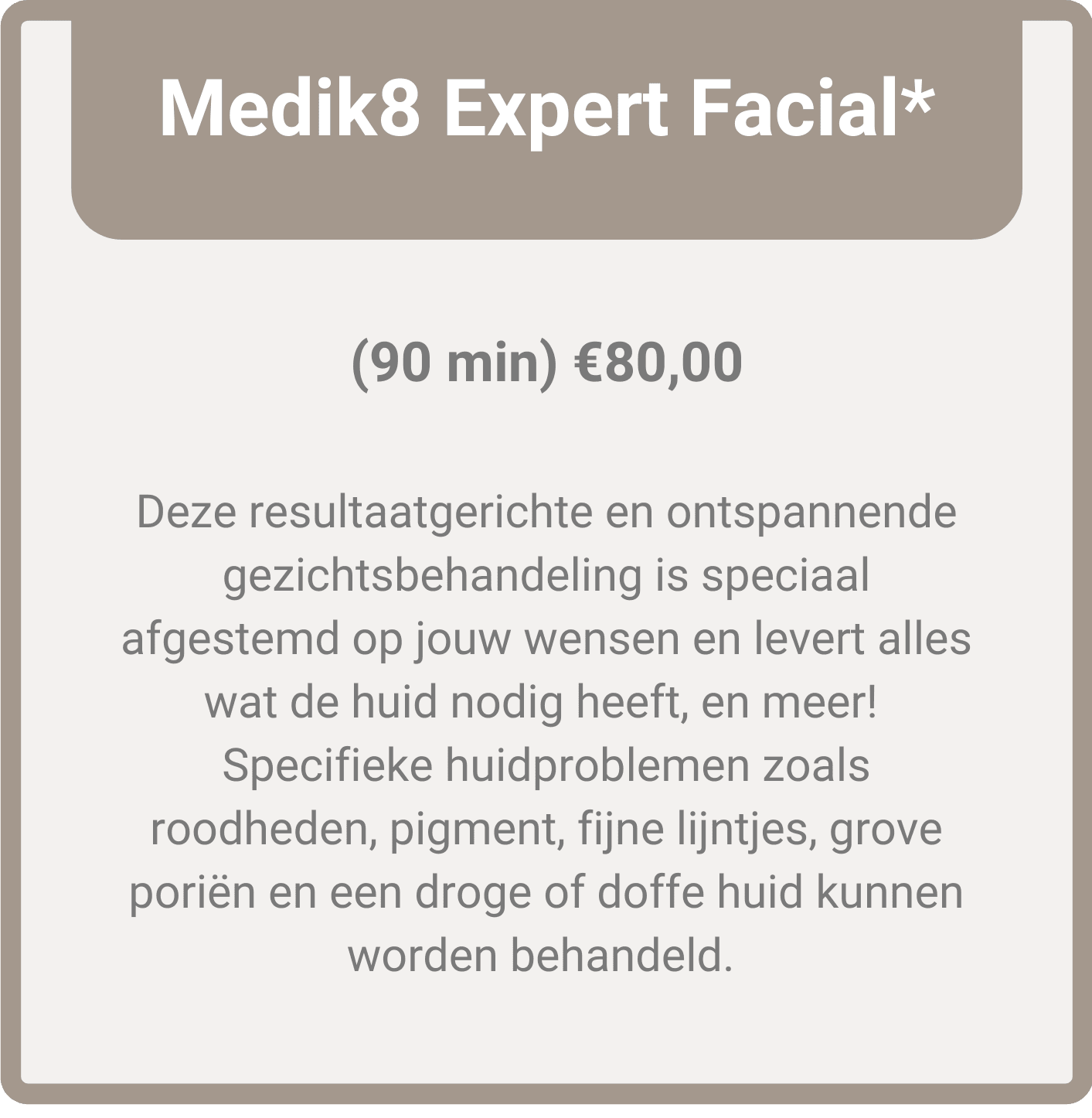 Wij geloven dat elke huid uniek is en daarom een persoonlijke aanpak verdient. Daarom stemmen wij elke behandeling af op jouw specifieke huidbehoeften en bieden wij een breed scala aan behandelingen die zijn afgestemd op de huid en jouw wensen, zodat je kunt genieten vaneen gezonde, stralende huid. Onze gezichtsbehandelingen zijn zorgvuldig samengesteld om de huid te verzorgen en te verbeteren. We gebruiken natuurlijke huidverzorgingsproducten van Dermasence en voor de huid verbeterende behandelingen Medik8 om te beste resultaten te bereiken.